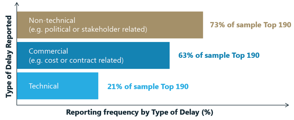 A study of the top 190 oil and gas projects around the world revealed that there was an average delay of 12 months for non-producing fields – 73% of these project delays were attributed to non-technical issues, including political or stakeholder related issues.1
